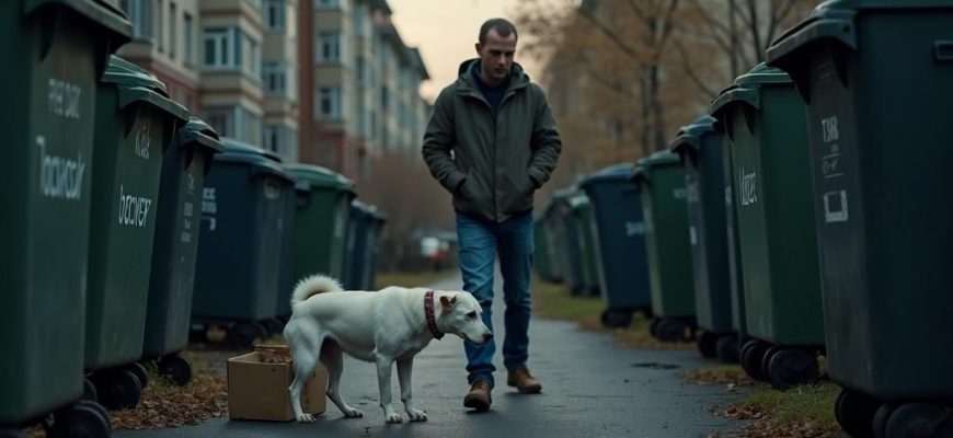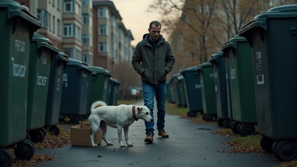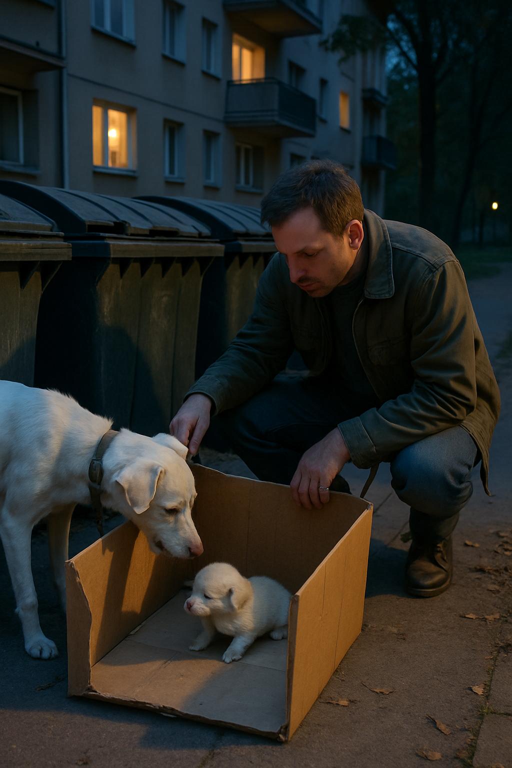Cățelușa s-a potolit o clipă și i-a aruncat o privire stăpânului. Apoi s-a apropiat de o cutie aflată lângă tomberon și a scâncit jalnic.
