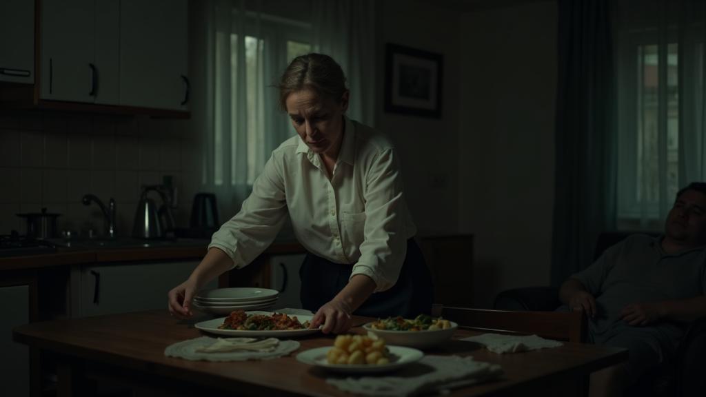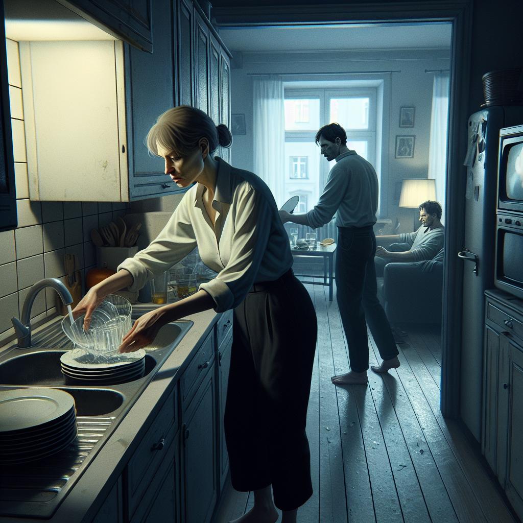 Ioana Popescu strângea mecanic vesela după cină, aruncând din când în când o privire către Mihai Ionescu, soțul ei, care se așezase ca de obicei în fotoliu în fața televizorului.