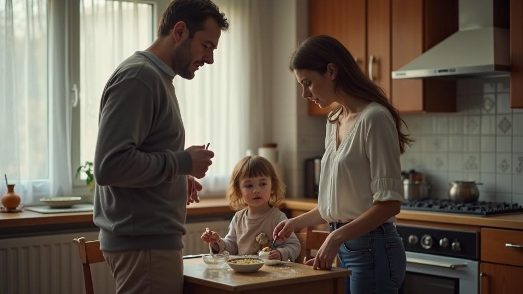 Lingura îi alunecă din mână Laurei și căzu cu un sunet înfundat în terciul neterminat al Marei. Fetița reacționă imediat: buzele i se strâmbară, sprâncenele i se uniră, iar din gât îi ieși un mârâit supărat. Laura, fără să-și dezlipească privirea de la Adrian, întinse mâna după un șervețel ca să șteargă terciul de pe bărbia copilului.