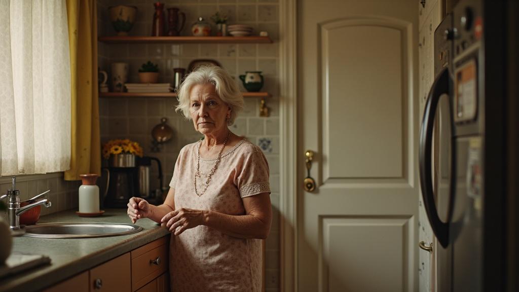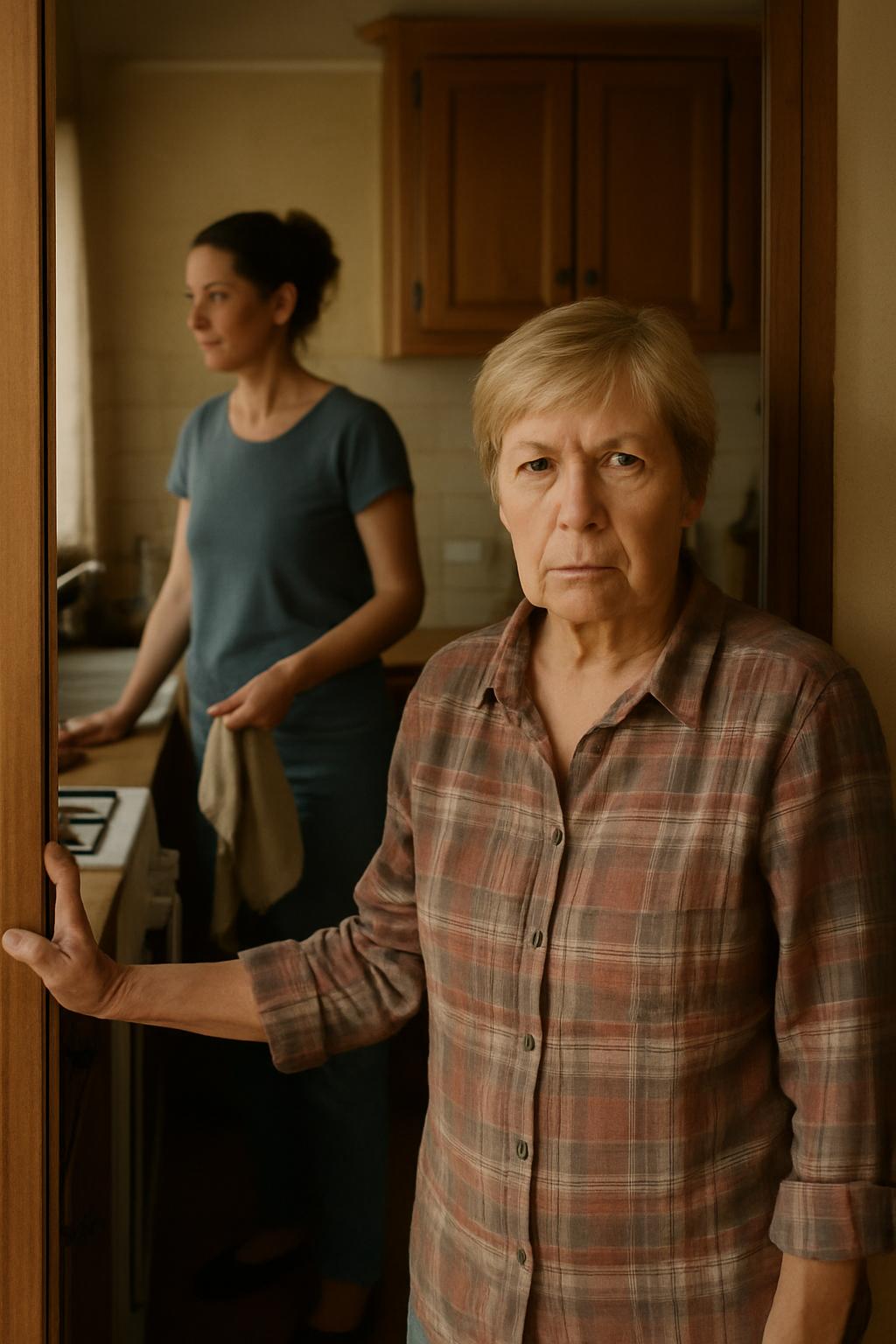 Ilinca stătea în pragul ușii de la intrare, cu geanta pe umăr și haina deja îmbrăcată. Se uită în jurul apartamentului — totul era în ordine, fiecare lucru la locul lui. Caterina, nora ei, spăla vasele în bucătărie, cu spatele la ea. Ilinca deschise ușa și spuse încet: