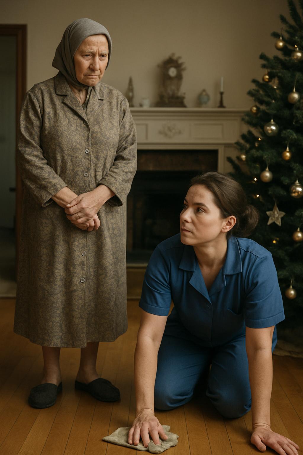 Atunci am văzut-o. La capătul holului, lângă baza scării, o femeie stătea în genunchi, cu spatele la mine. Purta o uniformă cenușie, fără formă, iar părul îi era acoperit cu o basma simplă. Freca obsesiv rosturile dintre plăcile de marmură cu o perie mică, aspră. Mișcările erau automate, obosite.