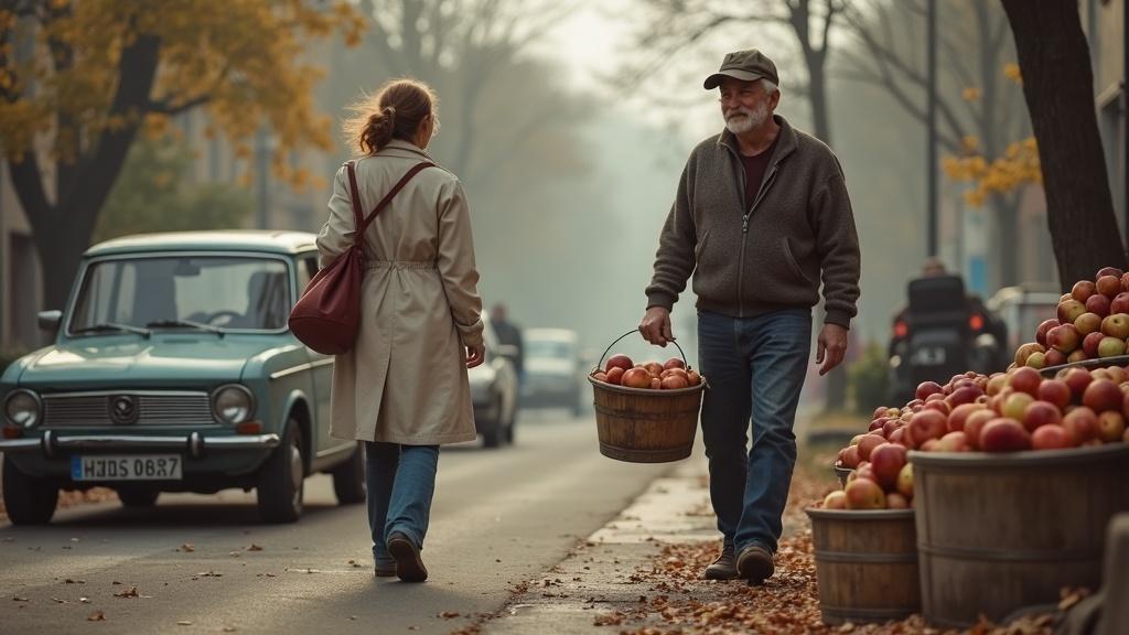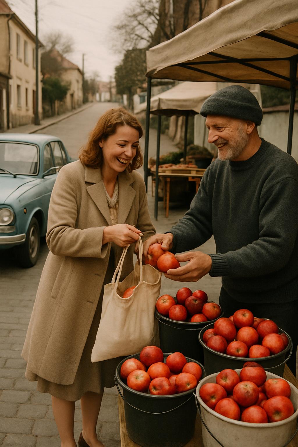 Conducând mașina ei veche, dar dragă, a trecut pe lângă mica piață improvizată de la începutul străzii. Impulsiv, a frânat și a decis să oprească. I s-a părut o idee minunată să cumpere niște mere mari și rumene pentru fiul ei și pentru soț. În plus, simțea și ea nevoia să muște dintr-un măr zemos, așa cum făcea în copilărie, la bunica, unde își petrecea toate verile fără griji.
