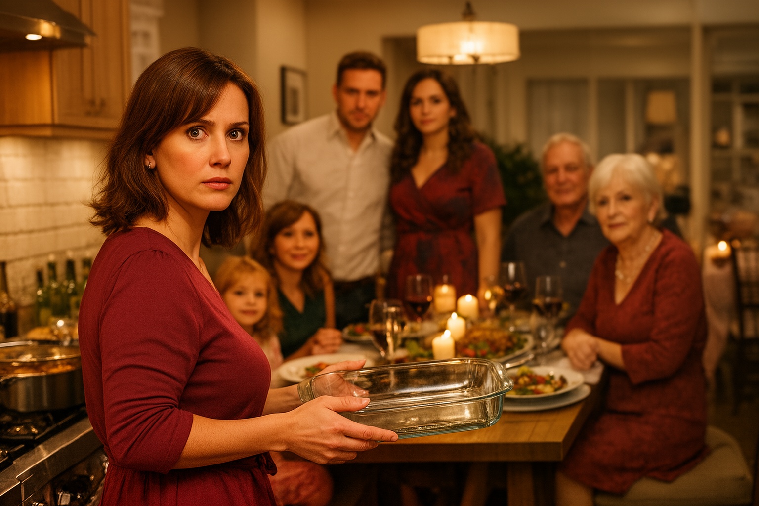 M-am ridicat încet. Am pus cartea pe masă. M-am dus la aragaz și am oprit toate focurile, unul câte unul. Felul principal — vițelul la cuptor — încă se gătea. Am oprit și cuptorul. Am deschis dulapul, am scos caserolele și am început să mut calm mâncarea de pe masă. Salate, platouri, aperitive. Tot ce se afla în fața invitaților. Mișcările mele erau precise, lipsite de grabă.