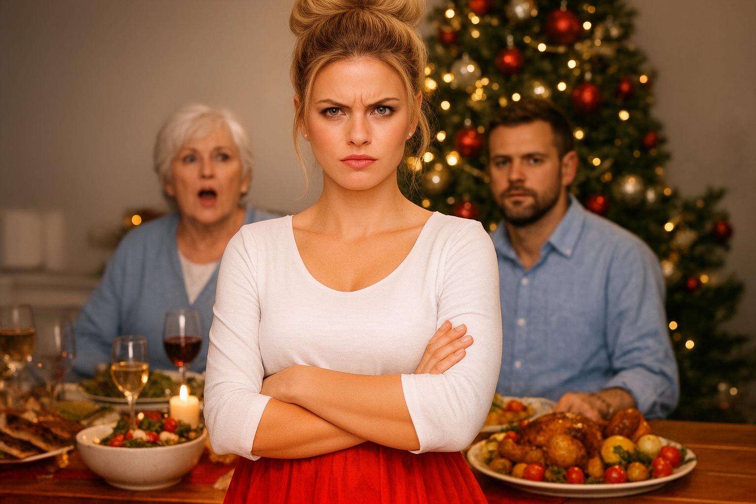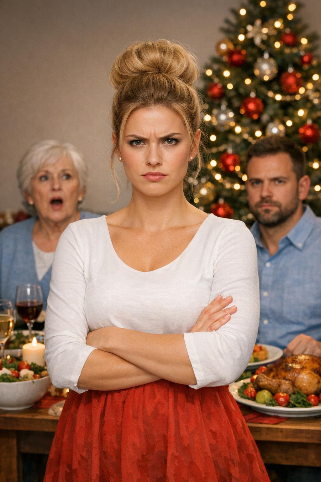 La masă, Silvia își netezea cu gesturi largi fața de masă festivă și stătea dreaptă, cu aer de stăpână, deși trăia în altă parte, în casa ei. Lângă ea, aprobând din cap și lovind absent lingurița de porțelan, se așezase Anca — o femeie masivă, cu trăsături aspre și ochi iuți, iscoditori. Și ea avea propria gospodărie, însă venea „de sărbători” doar ca să-și întărească sora cu sfaturi „înțelepte” și să o împingă să-i țină din scurt pe cei tineri.