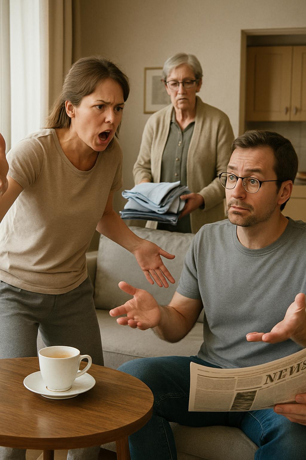 — Privește și tu, Paul Mureșan! Mama ta a venit iar fără să anunțe și ți-a spălat toate hainele. Și asta în condițiile în care eu le-am pus ieri la mașină și le-am călcat! Îți dai seama?