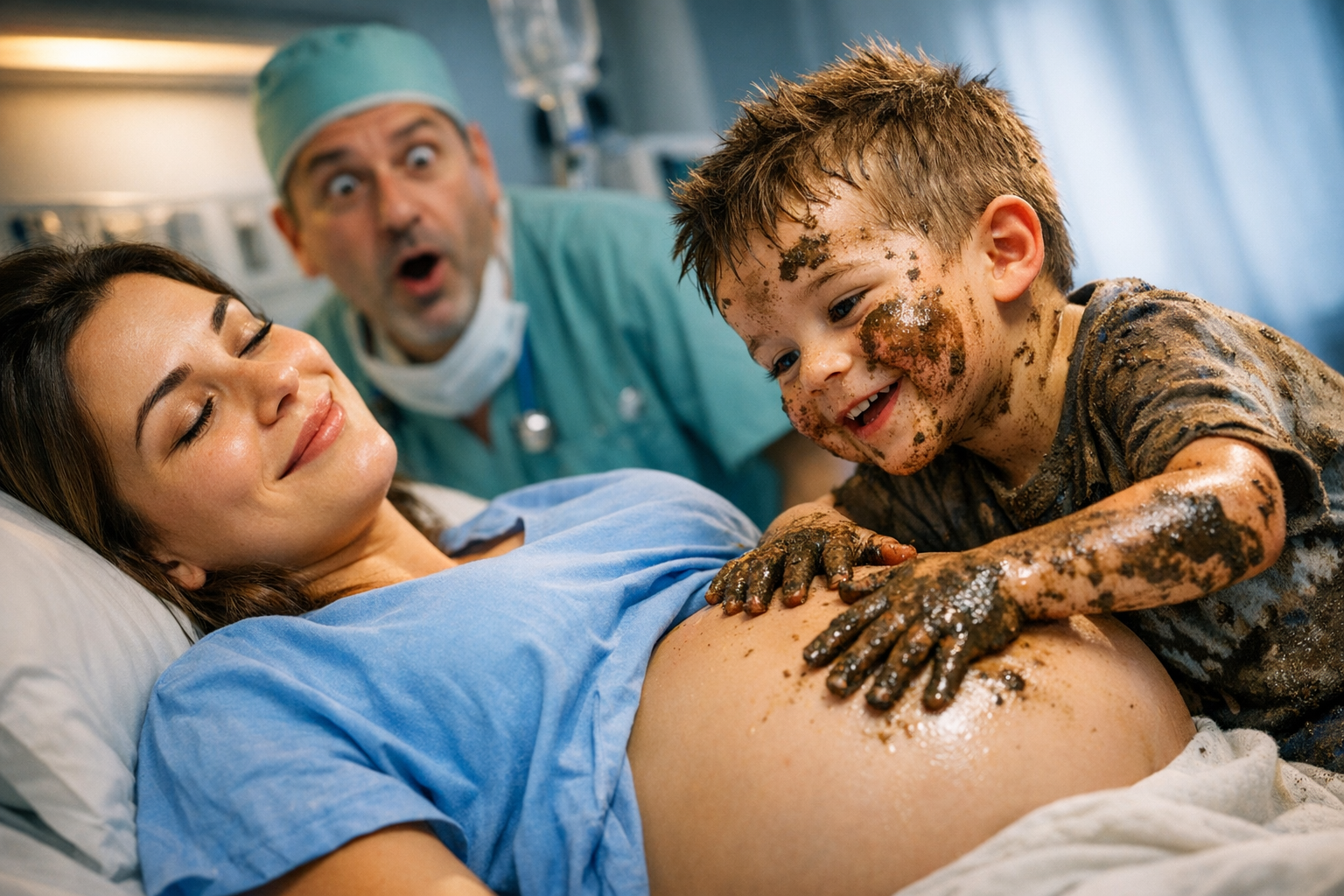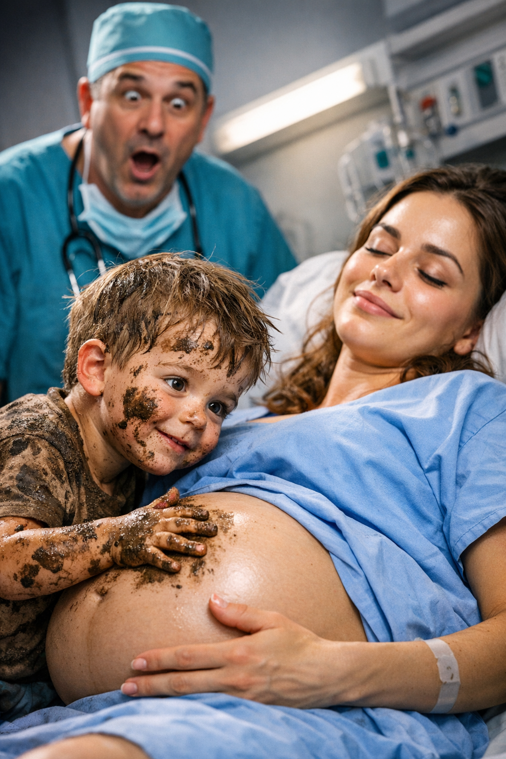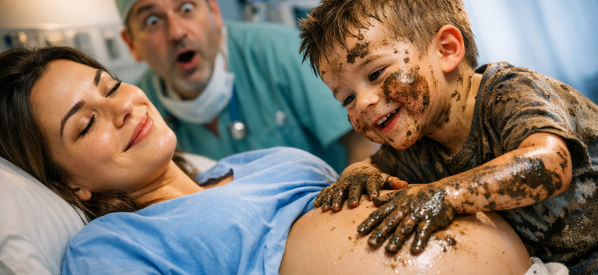 Răzvan și-a afundat degetele mici în nămol și, cu o siguranță neașteptată, l-a întins pe cămașa de spital a Danielei, exact peste rotunjimea pântecului ei. Mișcările îi erau atente, precise, de parcă ar fi urmat un desen invizibil.
