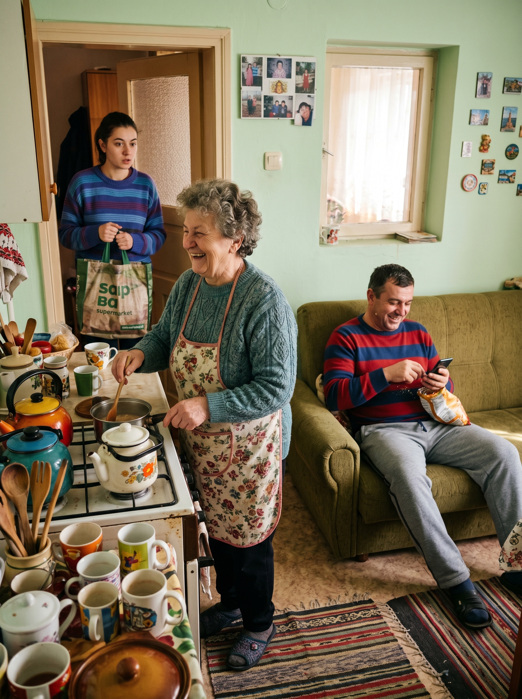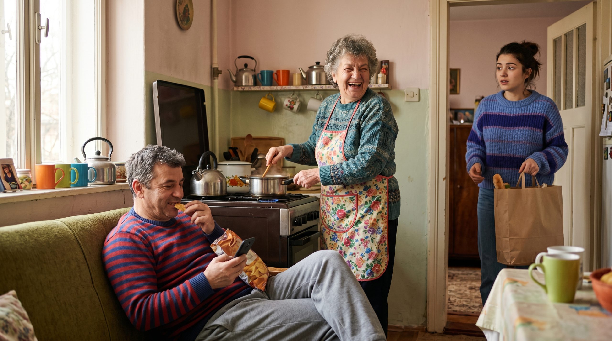Un mănunchi de chei a fost aruncat pe măsuța din hol, izbindu-se cu un clinchet metalic surd. În spațiul îngust plutea un miros greu de mâncare arsă, lână udă și fum de țigară învechit. Din sufragerie răzbătea bâzâitul constant al televizorului, amestecat cu trosnetul ritmic al unor gustări mestecate fără grabă.