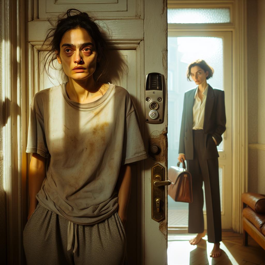 S-a ridicat în picioare — în tricoul ei vechi, cu părul prins într-o coadă sus și cu ochii umflați ca ai unei pande după o noapte de club. A pipăit pe podea, a tras pe ea niște șorturi, a alergat spre ușă și a privit prin vizor.