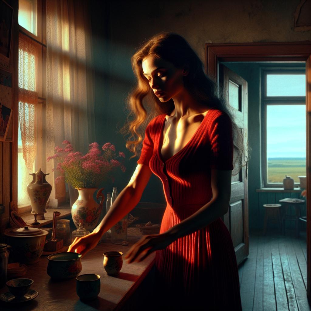 Și ea însăși era o femeie frumoasă și atrăgătoare. Ca un măr copt — plină de viață, puternică, cu sprâncene negre dese, o cosiță lungă până la brâu, piele albă și ochi verzi ca iarba verii.