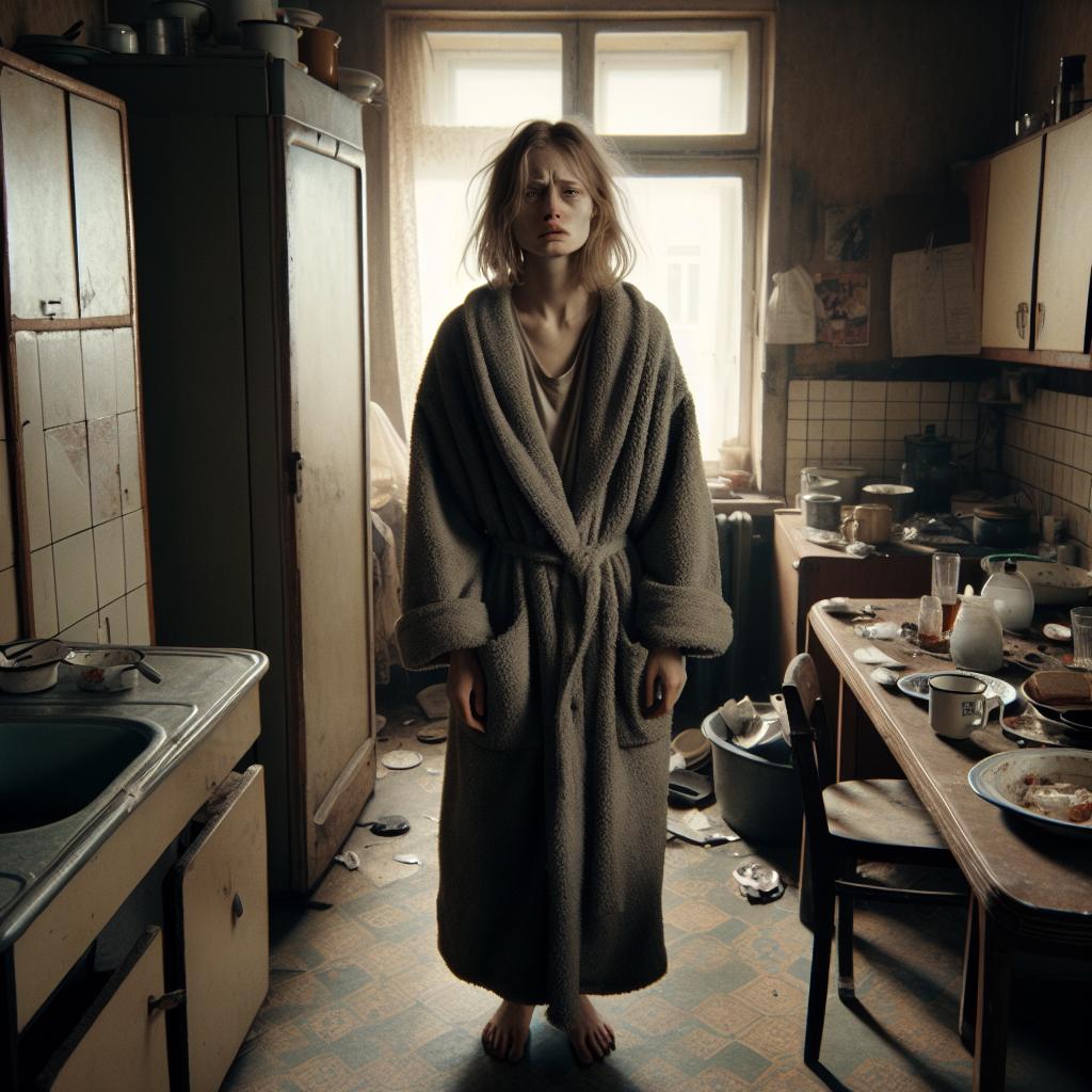 Ioana Popescu a ieșit pe coridor, strângându-și în fugă cordonul halatului. Pe masă stătea un borcan deschis de maioneză, pâine, brânză aruncată direct pe blat și un cuțit cu urme albe și grase. În chiuvetă — căni și linguri.