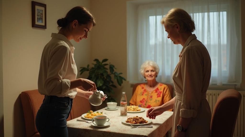 Oftă în timp ce aranja șervețelele pe masă. Andrei trebuia să ajungă de la serviciu la ora șapte, dar, ca de obicei, întârzia. Viorica sosise cu o oră mai devreme — „ca să ajute”, dar în loc de asta se instalase în fotoliu cu aerul unui general înaintea bătăliei.