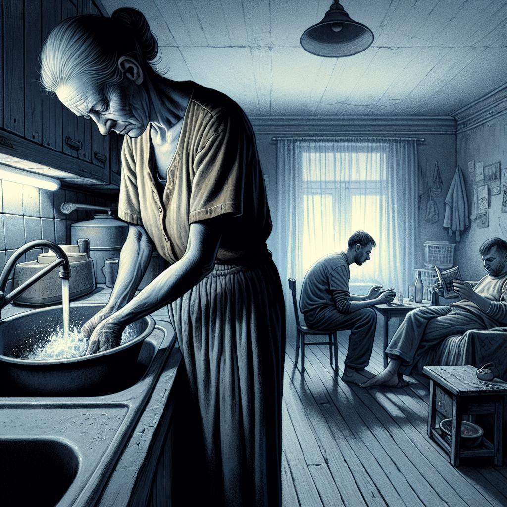 Gabriela spăla tăcut vasele, gătea cina și făcea curățenie prin casă. Rămânea tăcută când i se critica mâncarea („Teodora face pastele mai bune”), când i se aruncau remarci legate de vârstă („Vai Gabriela… ce riduri aveți sub ochi! Mama mea n-are deloc… ea are grijă de ea”), sau când portofelul era mereu gol pentru că Andrei nu se grabea să muncească serios — trândavind prin tot felul de „proiecte” online — iar Teodora considera că frumusețea ei este deja o meserie în sine.